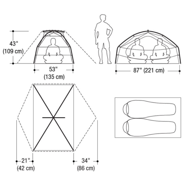A roomy zone construction increases livable space, while a super-sized double door and rear D-shaped door lead to two side vestibules to store and keep all your gear dry in wet weather.
