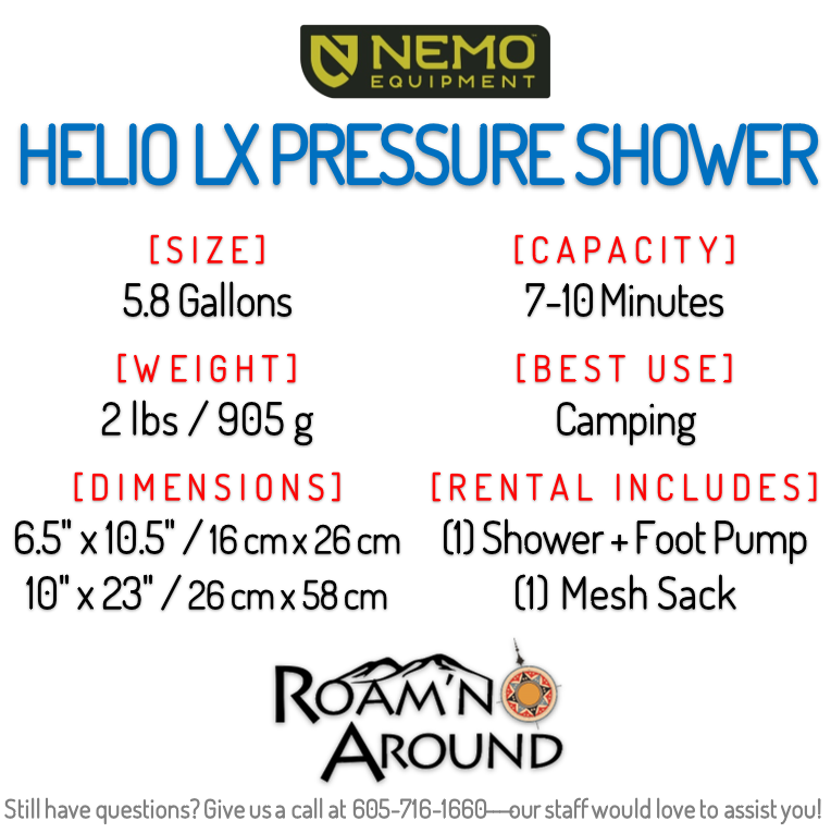 SKU: RENTAL:SHOWER:21-01 Categories: Camping, Portable Showers Tags: #camping, Badlands, Black Hills, Nemo, Portable Shower, Pressure Shower, Rapid City, SD, Solar Shower, South Dakota