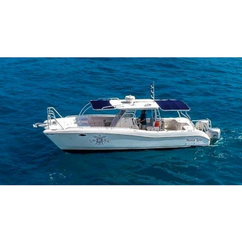 This speedy 33′ World Cat can zip us far down the coast quickly, getting you to special dive sites. On this 2 tank charter, we’ll spend the morning and early afternoon diving in South Kona’s incredible lava tubes, lush reefs, and a chance to view bigger pelagic animals such as whales, dolphins, or big fish on the ride down the coast. Or, venture North to experience unique reef structures and critter hideouts, or even drift around Kaiwi Point. Between your dives, enjoy a full lunch with views of the Kona coast.