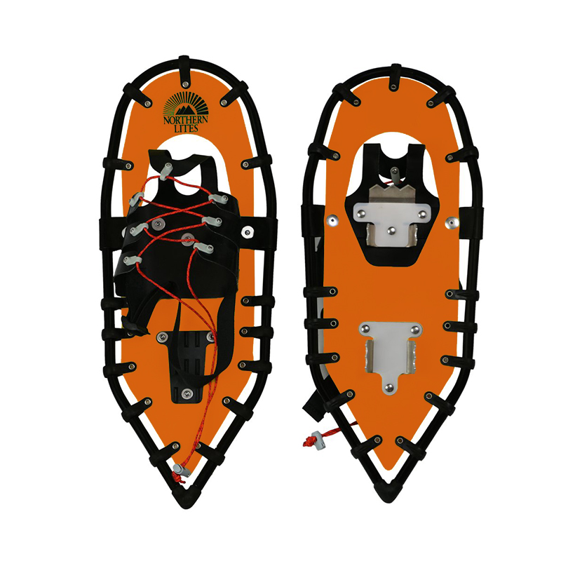 Northern Lites Race 20 inch snowshoes with orange decking on a black frame and Speed Bindings.