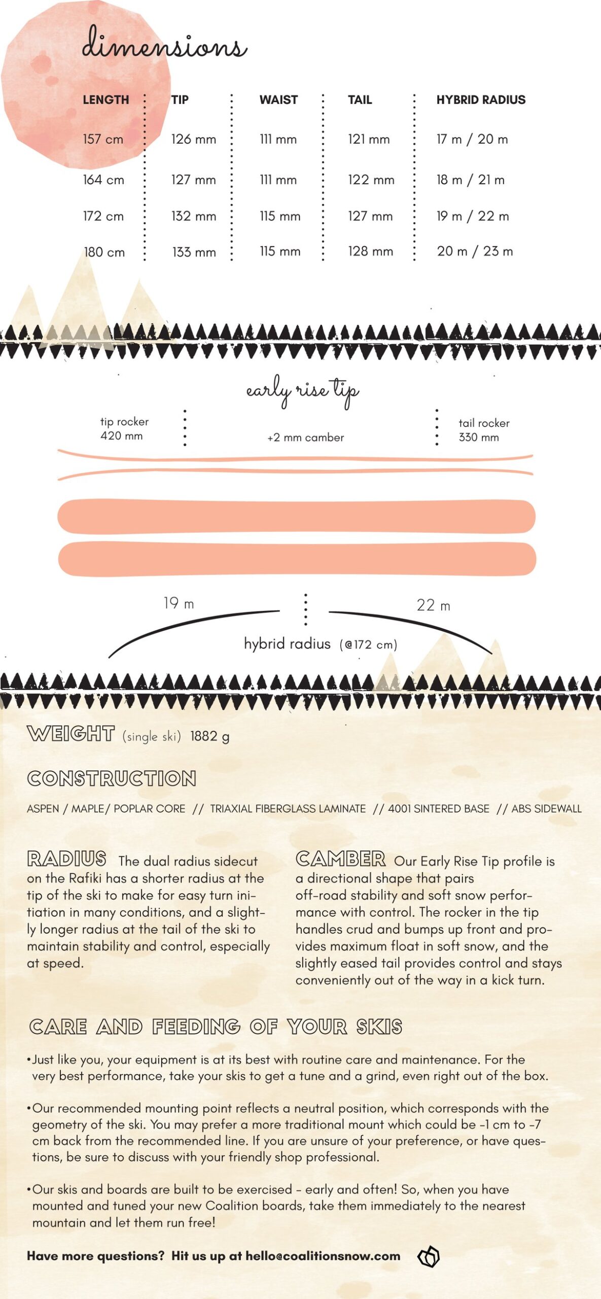 Rafiki means “friend” in Swahili and pays tribute to the trees that we plant in Kenya for every ski and snowboard we make. Indeed, this surfy pow slayer will be your best buddy when the snow flies. But don’t let the powder title fool you. This pivoty and nimble ski will float you through hokkaido deep drifts, twist through tight trees and bumps, and still carve a groomer with ease. An ample tip and waist provide the floaty ride, a pared-down tail makes for quick release and instant control, while camber underfoot is all business on the groomer. Fun at any speed, the Rafiki is your deep day (and everyday) besty.