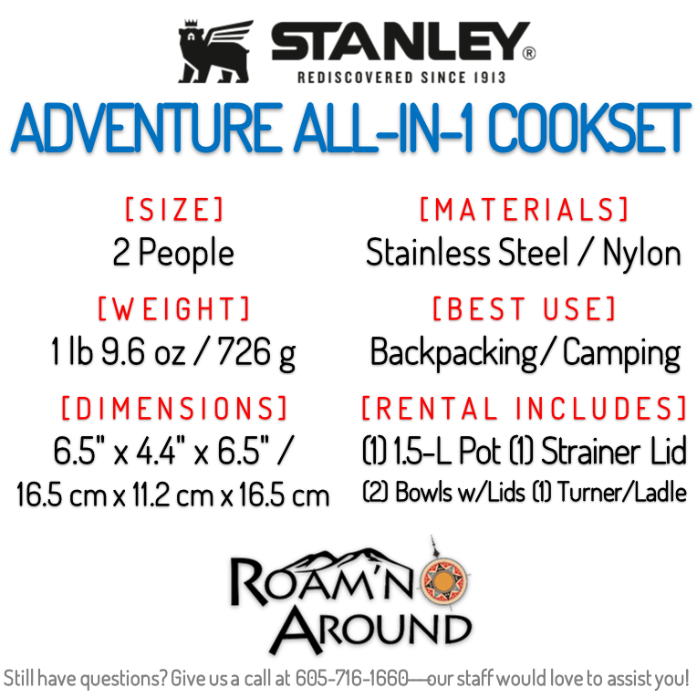 SKU: RENTAL:KITCHENCOOK:20-01 Categories: Backpacking, Camping, Camping Cookware Tags: #camping, backpacking, Badlands, Black Hills, Camp Cookware, Camp Kitchen, Rapid City, SD, South Dakota, Stanley